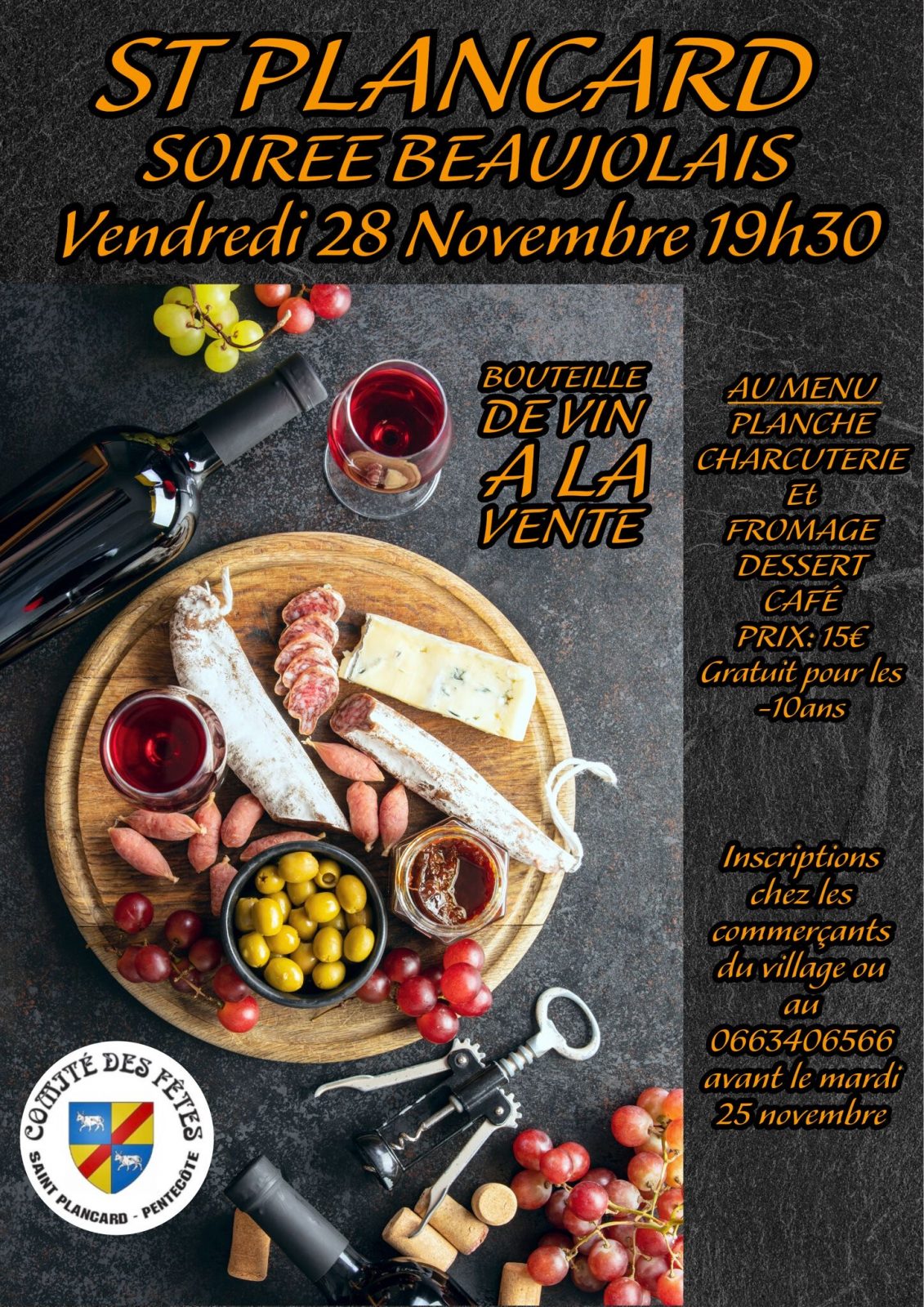 2 À propos Date Tarifs Soirée beaujolais! Le comité des fêtes du village propose une soirée gourmande autour d'un repas! Inscriptions chez les commerçants du village Menu: planche de charcuterie-fromage-dessert-café Date Le 28/11/2025 Tarifs Tarif Min. Max. Tarif adulte 15€ ID : FMAMID031V510CU1