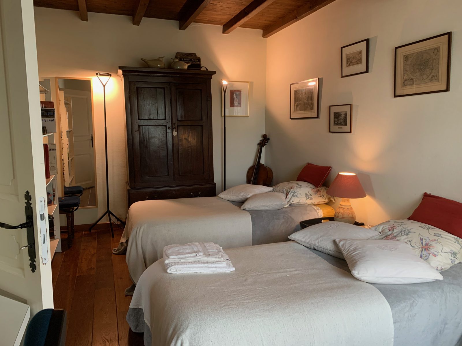 Chambre cosy et élégante avec vue sur le jardin dans une villa de charme en pleine nature, entourée de jardins fleuris et offrant des vues spectaculaires sur les Pyrénées. Idéal pour se ressourcer : nature, calme et détente assurés. Chambre pour 2 personnes (2 lits de 90×200 cm) peut accueillir un lit parapluie pour votre enfant gratuitement sur demande. Une banquette est disponible pour une troisième personne à 20€/nuit. Petit déjeuner bio. Grande salle de bain commune avec l'autre chambre d'hôtes. Vous avez accès à la terrasse orientée sud, où vous pourrez vous détendre tout en admirant, au premier plan, le paysage vallonné et enchanteur ainsi que le lac de Saint-Frajou, et au loin, la chaîne des Pyrénées. L'été la terrasse Nord vous offre sa fraîcheur. Vous partagerez le magnifique et accueillant salon/salle à manger avec TV, WIFI, poêle à bois pour l’hiver et système audio. Cet espace cosy s’ouvre directement sur la terrasse ensoleillée du sud, idéale pour savourer un café au lever du soleil en été. Détendez-vous dans le hamac sous les arbres, sur la balançoire, ou installez-vous sur les terrasses nord ou sud et laissez-vous porter par le silence. En été, plongez dans la piscine au sel (11 × 6 m), parfaite pour les baignades relaxantes ou pour faire quelques longueurs sportives, ouverte d'avril à novembre selon la saison. Le propriétaire se réserve des moments de baignade à définir avec vous. Vous pouvez également vous détendre sur les chaises longues, jouer au tennis de table, à la pétanque, au badminton ou au football, partir en balade ou faire du vélo dans la forêt — des vélos sont mis à disposition.