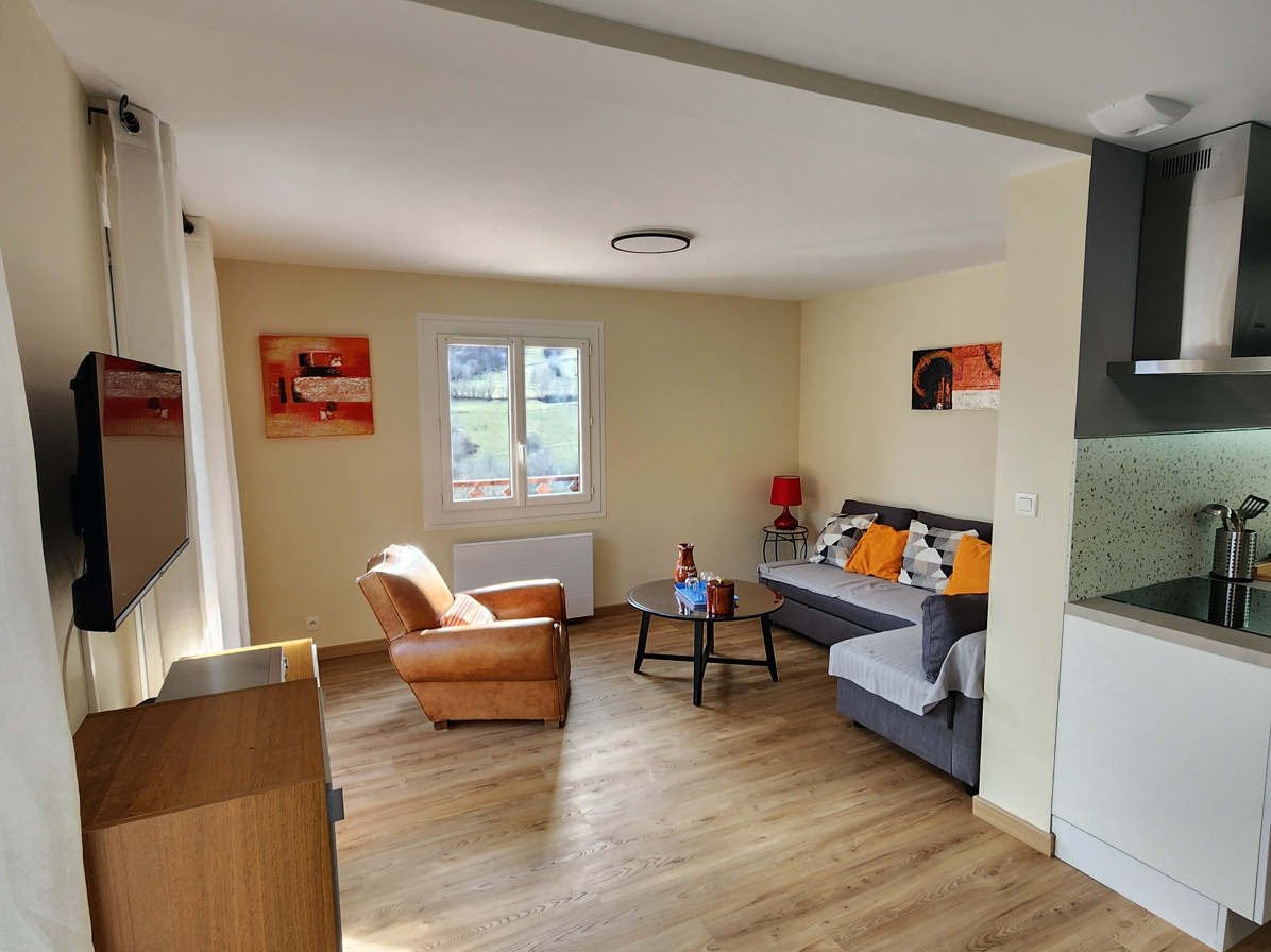 Appartement situé au rdc d’une petite résidence située entre Luchon et Peyragudes à Castillon de Larboust. Il bénéficie d’une exposition sud-est, d’une grande terrasse de 20 m², ainsi que d’un parking privatif. Il est clair et lumineux. Les vues sont dégagées sur la montagne environnante. Les fenêtres sont équipées de moustiquaires et de volets. Il est équipé du WIFI, dispose d’un espace de travail. Il se compose : D’une grande pièce de vie avec salon comprenant un canapé convertible, un fauteuil, une table de salon, un meuble de salon et d’une télévision écran plat, D’une cuisine ouverte totalement aménagée avec plaque de cuisson, hotte aspirante, four multifonctions, micro-onde, lave-vaisselle, réfrigérateur et congélateur. Très bien équipée en vaisselle, batterie de cuisine et petit électroménager. D’un espace repas avec table à manger et six chaises. De deux chambres dont une avec un lit 160*200 et 2 meubles individuels aménagés pour le rangement des vêtements, la seconde comprend 2 lits individuels de 90*190 pouvant être rapprochés pour former un grand lit, deux tables de nuit, une tête de lit de 2.40m et deux armoires aménagées de 75*202 pour le rangement des vêtements D’un cellier aménagé avec penderie, table et fer à repasser, séchoir sur pieds, Aspirateur, produits d’entretien et nécessaire de ménage D’une salle de bains équipées d’une grande douche fermée avec paroi en verre, un plan de toilette avec vasque, meuble avec tiroir, sèche-cheveux, sèche serviette sur pieds et sèche serviette électrique, miroir avec applique D’un WC séparé, WC suspendu avec aménagement mural, brosse et porte-papier sur pieds, poubelle.