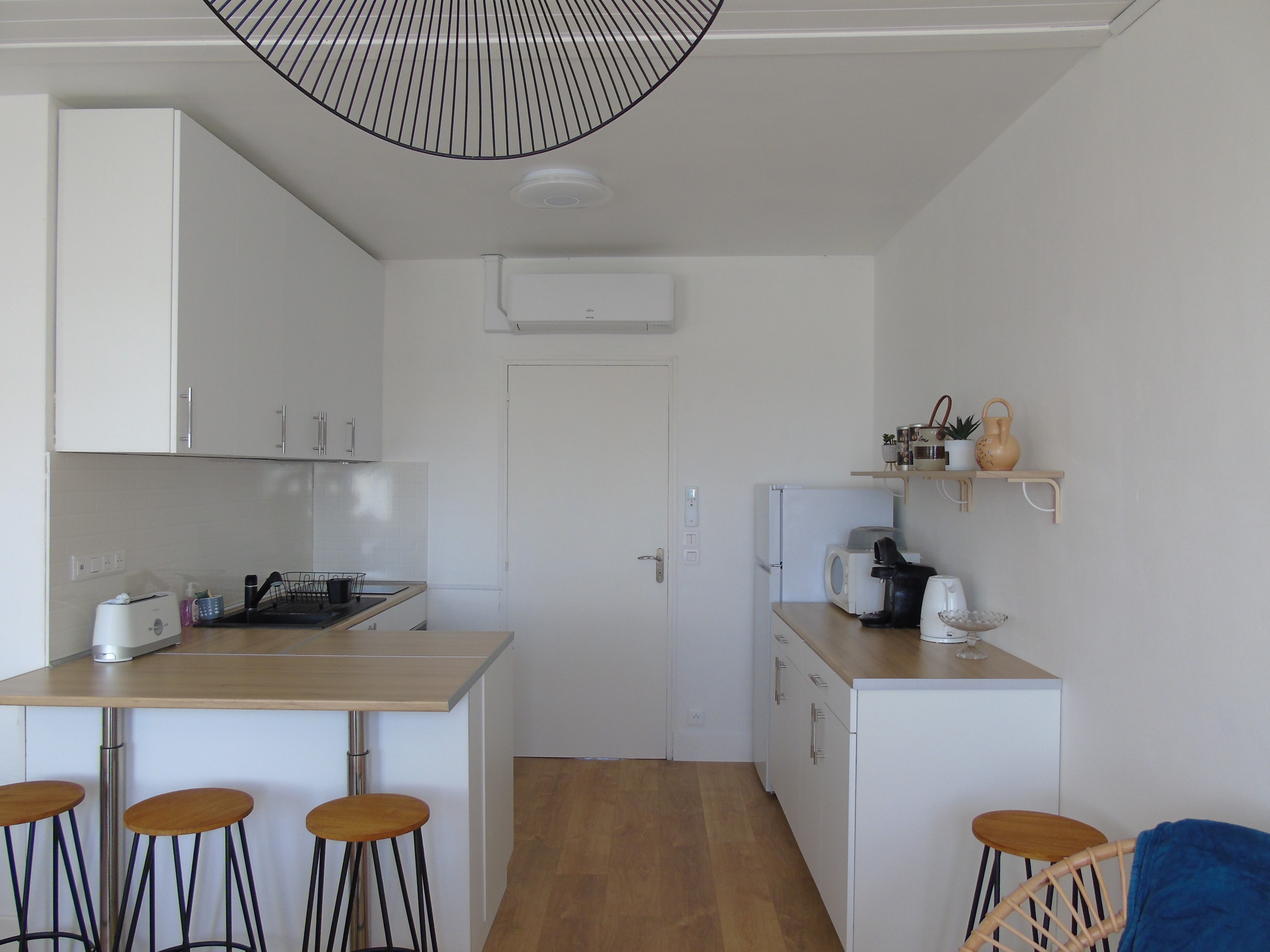 Appartement entièrement rénové, tout équipé. Possibilité d'accueillir jusqu'à 4 personnes (canapé convertible 2 places). Accès par escalier extérieur. Parking privé.