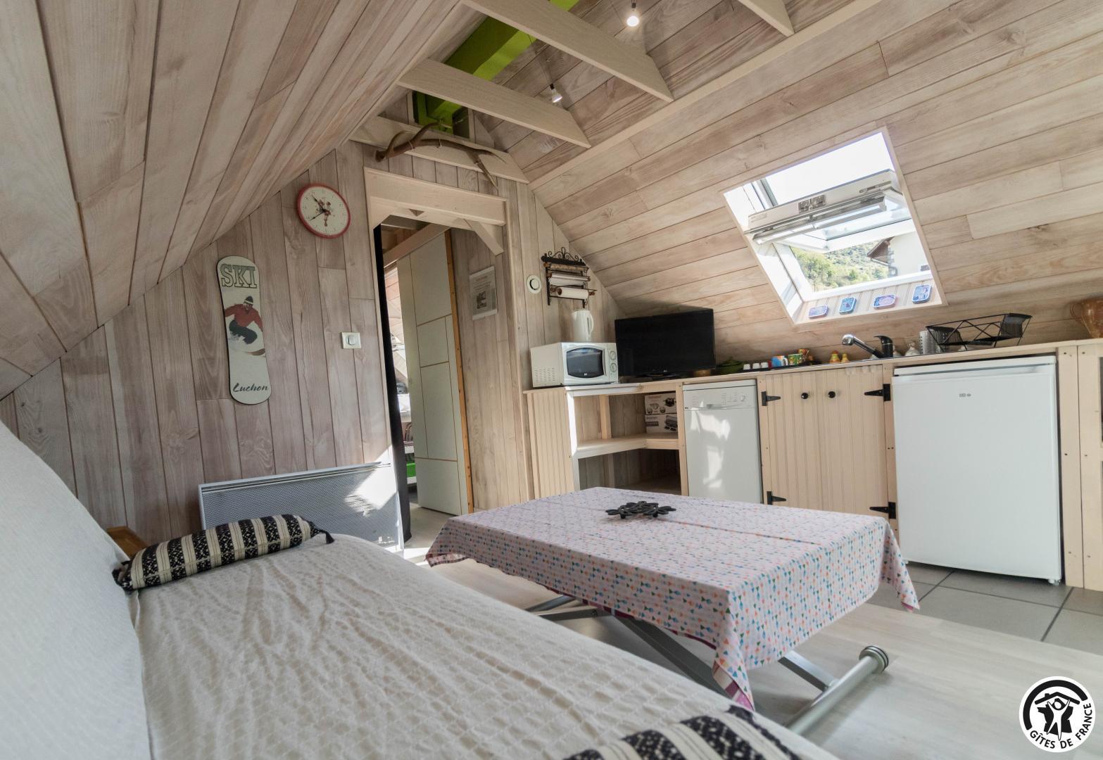 Très bien équipé (appareil à raclette, grill multifonction : croque monsieur, plancha...) et très confortable, vous serez idéalement placés pour vos séjours en amoureux au coeur des Pyrénées. Nombreuses activités à proximité : 7km de Bagnères-de-Luchon (grand site région Occitanie), station de ski Luchon-Superbagnères et thermes de remise en forme. L'été, la reine des Pyrénées, est attractive pour louer des vélos et descendre les montagnes, mais aussi faire du canyoning, du rafting et du canoë-kayak ! Espagne à 14km du gîte, station de ski de Peyragudes à 9km, randonnée du lac d'Oô à 7km, base nautique d'Antignac à 10km et parc d'accrobranches de Pyrénées Hô à 24km. Saint-Bertrand-de-Comminges, un des villages préférés des français à 39km. Studio de plain-pied de 16m2, après avoir descendu 3 marches : entrée, WC indépendant, salle d'eau avec douche et vasque, coin-nuit avec 1 lit pour 2 personnes de 140*190cm (TV écran plat), séjour avec cuisine tout équipée (2 réfrigérateur dont un avec compartiment congélateur, une cafetière Senseo et une cafetière classique, gazinière avec 4 feux et un four, micro-ondes), canapé-convertible pour 2 personnes en 140*190cm (et une TV écran plat), une table basse relevable adaptable pour les repas. Accès Internet Wifi. Place privative pour une voiture à 10 mètres du gîte. Salon de jardin.