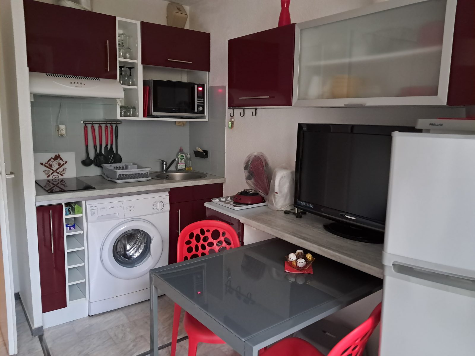 Studio équipé avec internet gratuit, acceptant les chèques vacances, avec petite terrasse exposée plein sud. Canapé lit 140 x 200 dans la pièce de vie, lit 120 x 200 dans l’alcôve. Coin cuisine équipé avec plaque vitro, four multifonctions, réfrigérateur, congélateur, lave linge, cafetière a dosettes et classique, divers appareils électroménagers, TV, lecteur DVD, ventilateur sur pied. Salle de douche, WC séparés, sèche cheveux. Nombreux rangements, cave.