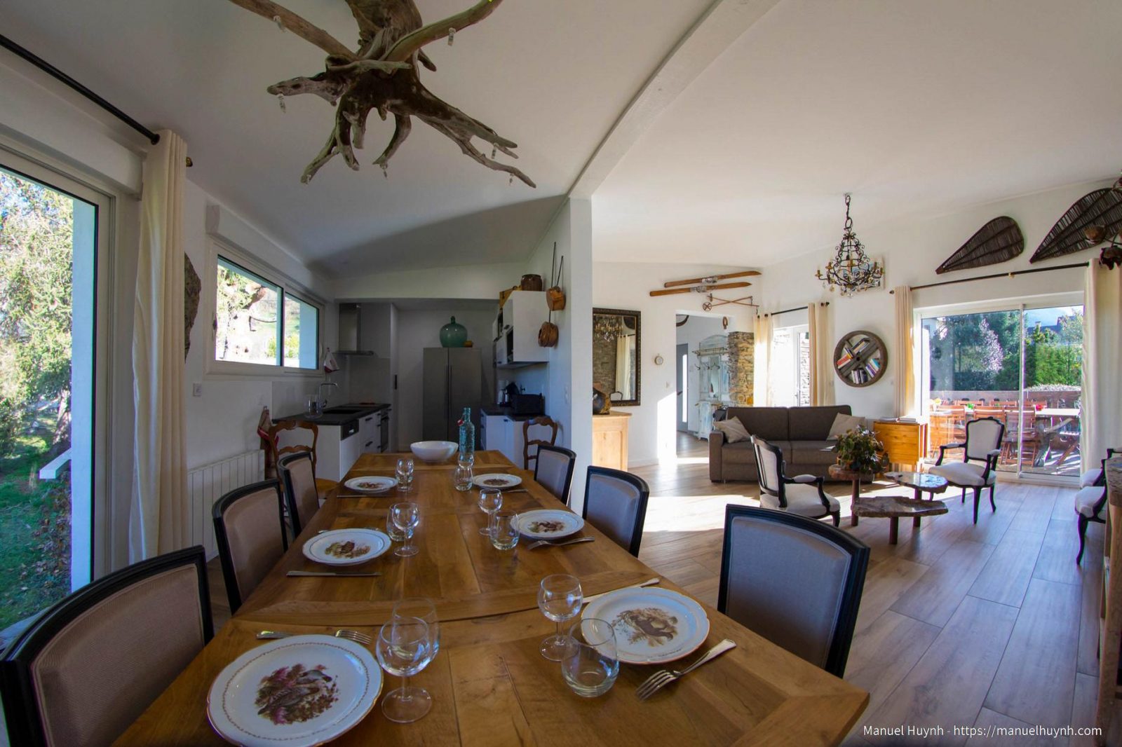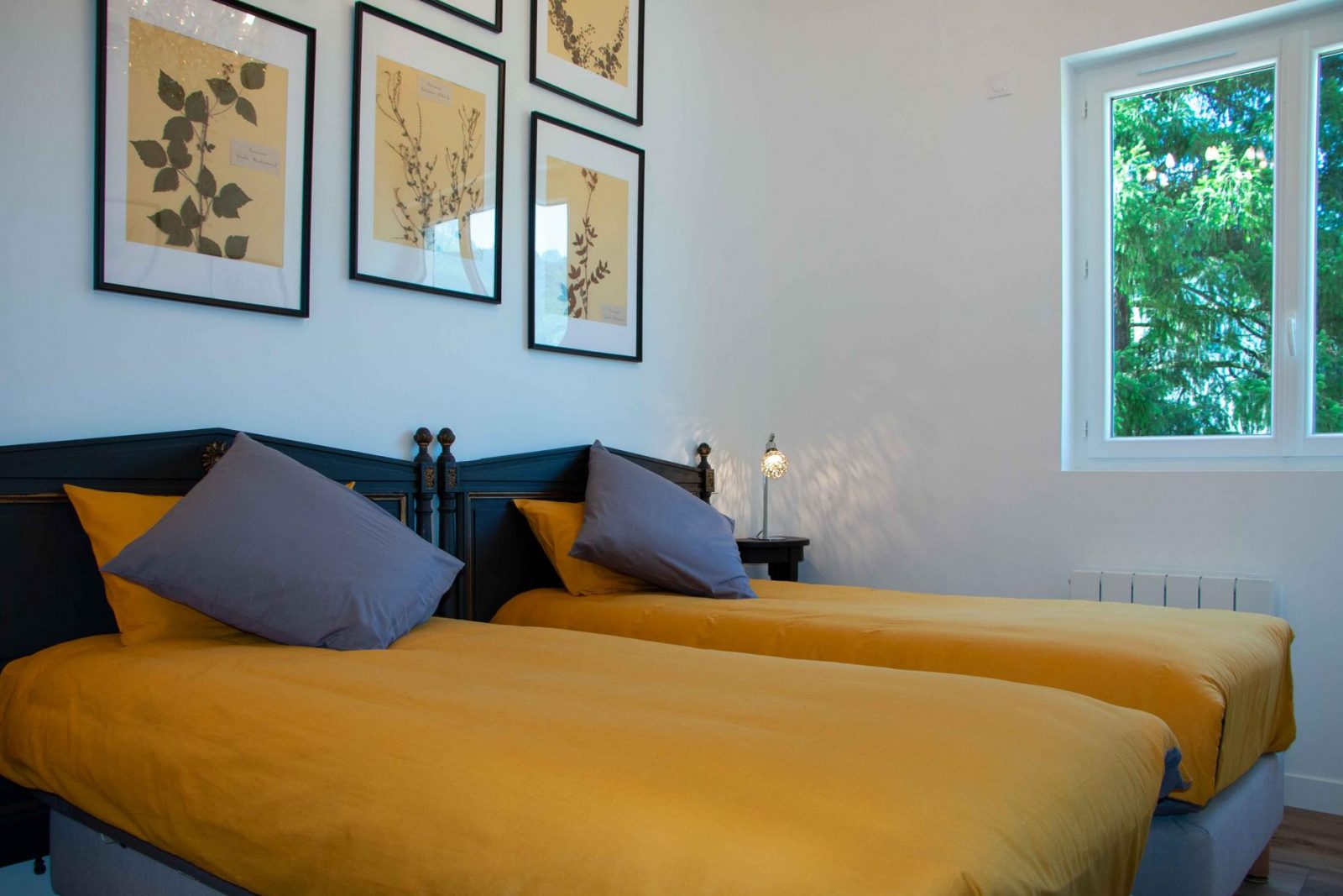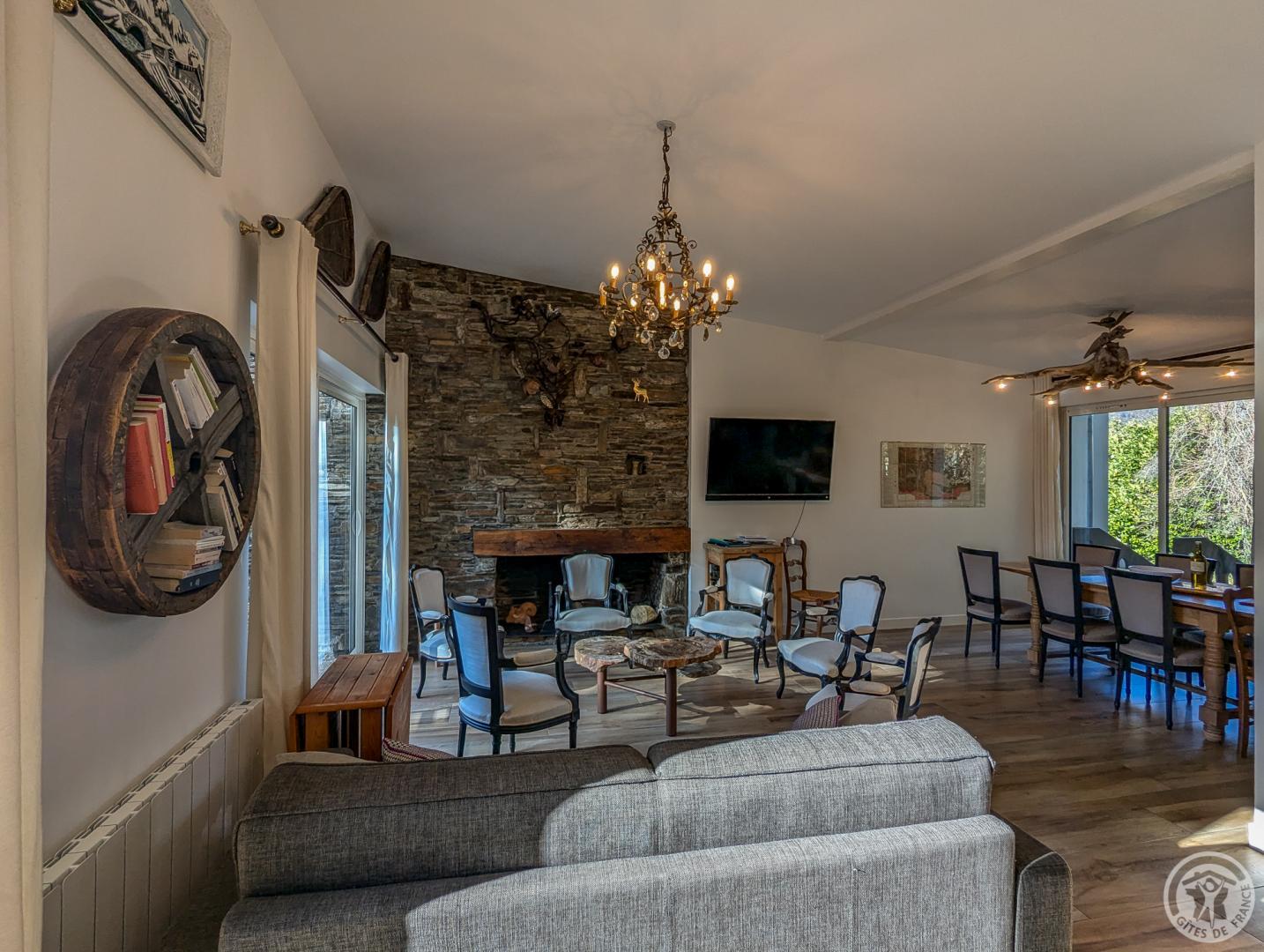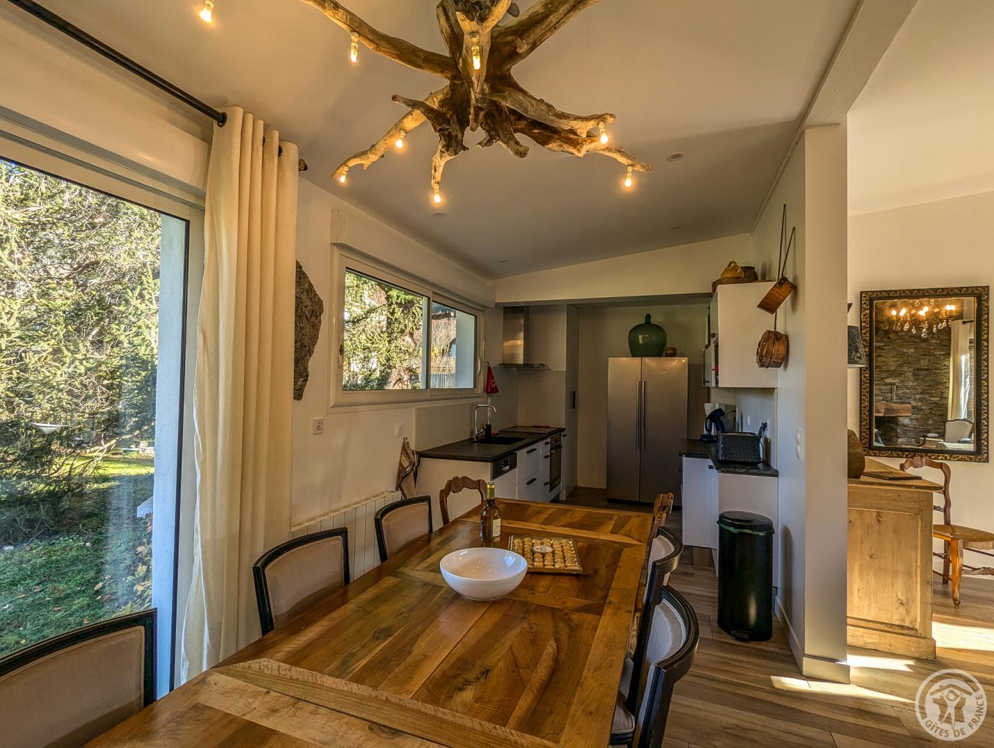Décoration montagne somptueuse. Sa grande pièce à vivre vous offre un cadre parfait pour vous détendre après une journée de ski ou après une randonnée. Depuis la terrasse ensoleillée, vous apprécierez la vue sur Superbagnères et des sommets entourant Luchon. Grand jardin arboré et clos avec table haute en pierre du pays et table avec bancs en pierre à l'ombre du cèdre et des grands sapins ! La maison est à 3 km de la station de ski Superbagnères via la télécabine et 17 km de Peyragudes (ou 2 km de la navette y menant). Venez découvrir les Pyrénées et Luchon (dans la ville : thermes, ski, pêche, golf, vélo ; aux alentours : base d'Antignac avec rafting et canoë...). Accès à la maison par trois marches, entrée, grande pièce à vivre très agréable et lumineuse avec espace salon, espace repas et cuisine intégrée ouverte sur le séjour, chambre "Art Populaire" (1 lit pour 2 personnes en 160cm avec sa salle d'eau privative : douche à l'italienne de 140 x 90 /lavabo/WC), chambre "Aux Oiseaux" (1 lit pour 2 personnes en 160cm avec salle d'eau commune, communicante : douche à l'italienne de 140 x 90/lavabo/WC), chambre "De L'herbier" (2 lits pour 1 personne en 90cm, possibilité de les jumeler) et chambre de 10m2 "Explorateurs" (4 lits 1 personne en 90x200cm superposés), Salle d'eau commune : douche à l'italienne de 120 x 90/lavabo. WC indépendant avec lave-mains. Buanderie : machine à laver le linge et sèche-linge, portant et étagères pour sécher les affaires de ski ou de randonnées (radiateur électrique). Garage pour 1 voiture ou vélos ou motos.