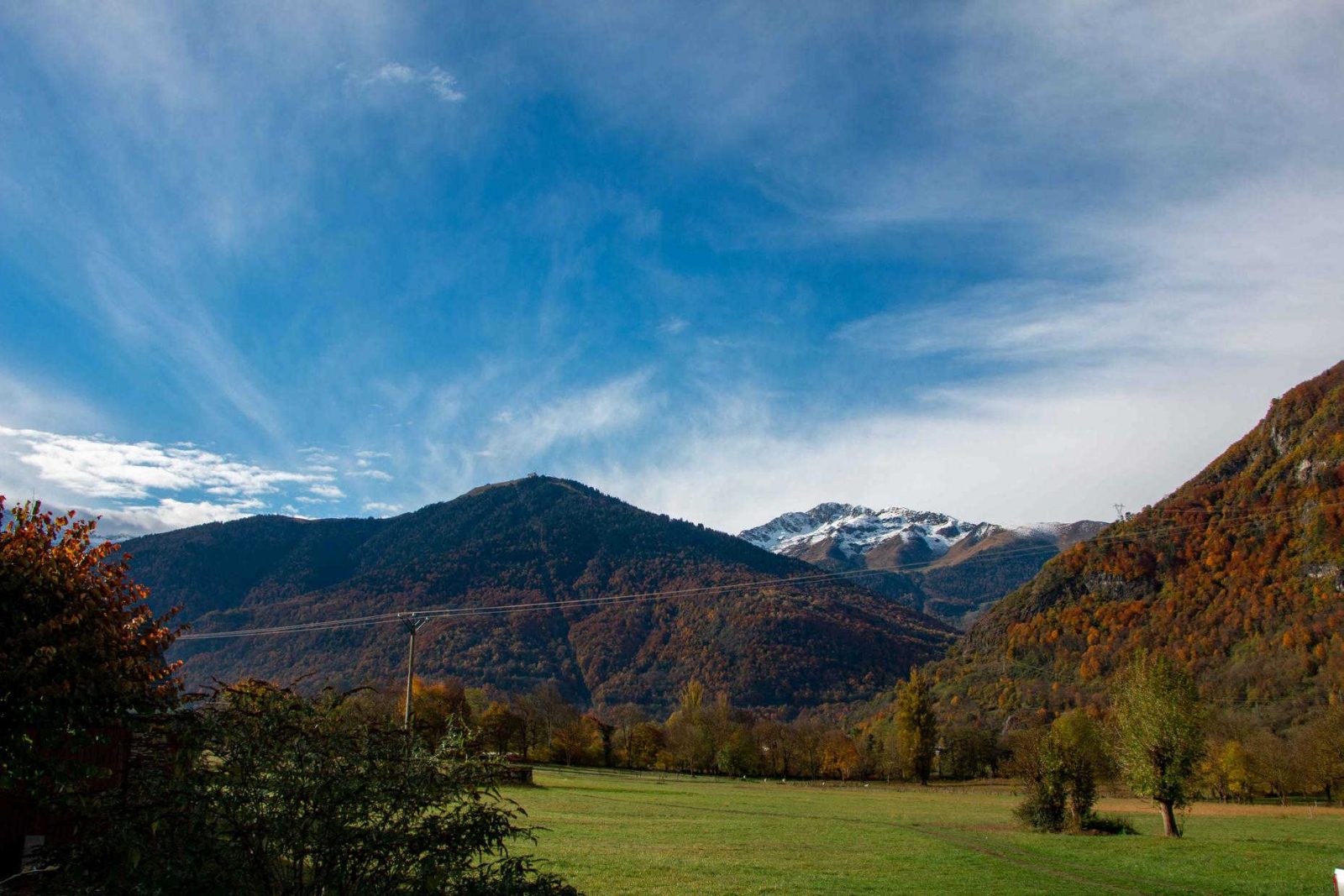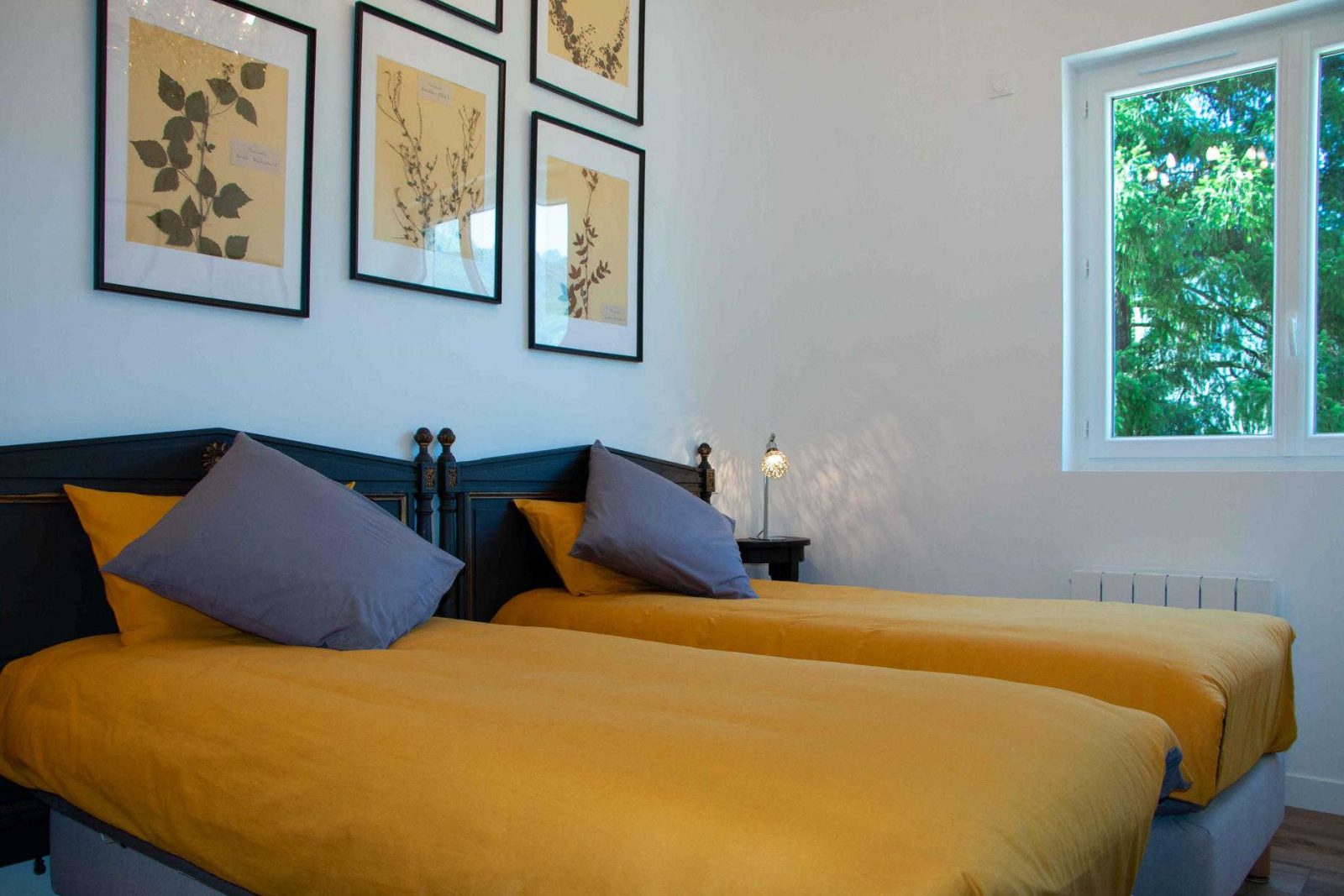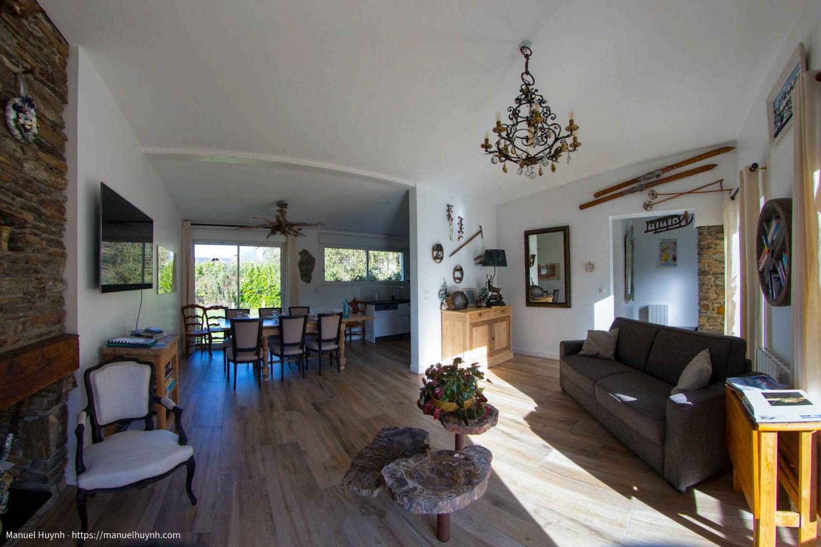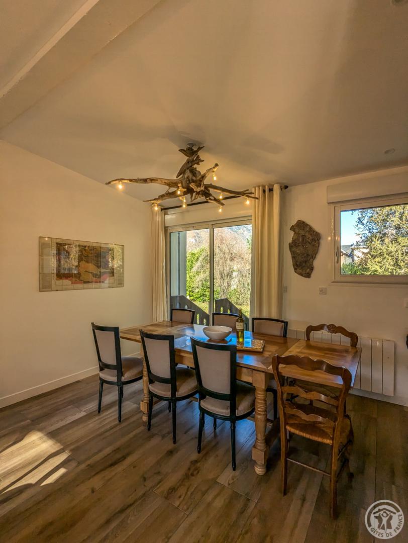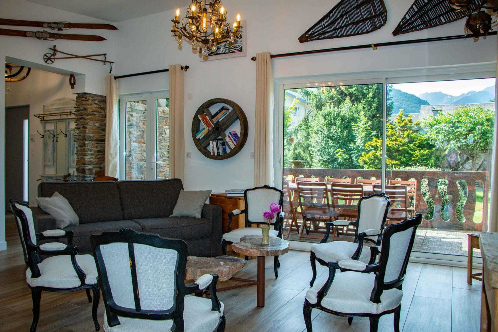 Décoration montagne somptueuse. Vue depuis le jardin à couper le souffle. Sa grande pièce à vivre vous offre un cadre parfait pour vous détendre après une journée de ski ou après une randonnée. Depuis la terrasse ensoleillée, vous apprécierez la vue sur Superbagnères et des sommets entourant Luchon. Grand jardin arboré et clos avec table haute en pierre du pays et table avec bancs en pierre à l'ombre du cèdre et des grands sapins ! La maison est à 3 km de la station de ski Superbagnères via la télécabine et 17 km de Peyragudes (ou 2 km de la navette y menant). Venez découvrir les Pyrénées et Luchon (dans la ville : thermes, ski, pêche, golf, vélo ; aux alentours : base d'Antignac avec rafting et canoë...). Accès à la maison par trois marches, entrée, grande pièce à vivre très agréable et lumineuse avec espace salon, espace repas et cuisine intégrée ouverte sur le séjour, chambre "Art Populaire" (1 lit pour 2 personnes en 160cm avec sa salle d'eau privative : douche à l'italienne de 140 x 90 /lavabo/WC), chambre "Aux Oiseaux" (1 lit pour 2 personnes en 160cm avec salle d'eau commune, communicante : douche à l'italienne de 140 x 90/lavabo/WC), chambre "De L'herbier" (2 lits pour 1 personne en 90cm, possibilité de les jumeler) et chambre de 10m2 "Explorateurs" (4 lits 1 personne en 90x200cm superposés), Salle d'eau commune : douche à l'italienne de 120 x 90/lavabo. WC indépendant avec lave-mains. Buanderie : machine à laver le linge et sèche-linge, portant et étagères pour sécher les affaires de ski ou de randonnées (radiateur électrique). Garage pour 1 voiture ou vélos ou motos